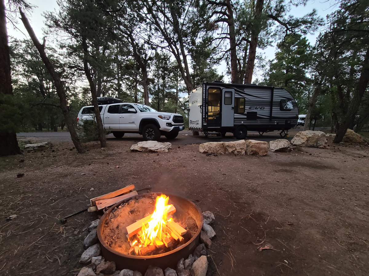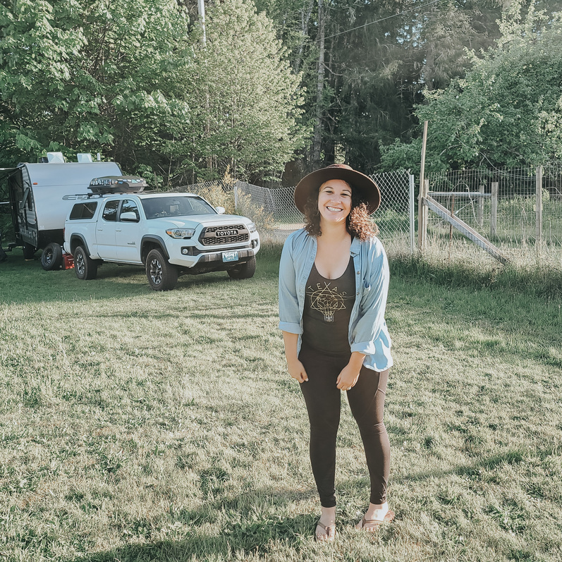 I travel full-time with my Toyota Tacoma, 17 foot toy-hauler trailer, husband, and my fur kids Tiskies and Butters. I grew up camping and have camped in everything from tents, to cars, to pop-up tent trailers, to 26+ foot travel trailers.